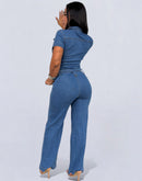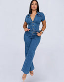 - ◆ Stretch Denim Belted Jumpsuit Short Sleeve One Piece for Women