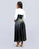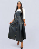 Mejora tu estilo con este vestido atrevido y exclusivo que combina a la perfección los materiales contrastantes para crear un look moderno y atrevido, mientras que la cintura ceñida con un elegante cinturón aporta forma y estructura. Las mangas tres cuartos con llamativos botones delanteros le dan a esta pieza un toque vanguardista, lo que la convierte en una prenda imprescindible para aquellas con un fuerte sentido del estilo y la actitud. Ya sea que te vistas para un evento diurno o para una salida nocturna, este vestido irradia confianza y sofisticación, lo que garantiza que llamarás la atención dondequiera que vayas.