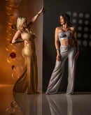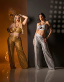 Step into the spotlight with this eye-catching set, featuring a sleek top and tailored pants adorned with stunning metal accents. The top’s striking metal detailing at the neckline adds a bold, edgy touch, while the pants feature a unique metallic accent at the waist for a perfect balance of glamour and sophistication. Designed with shiny, reflective tones, this set is perfect for those who love to stand out and make a statement. Whether you're attending a night out or a special event, this ensemble offers the perfect mix of luxury, style, and modern edge. Turn heads and shine bright with this exclusive, one-of-a-kind look.